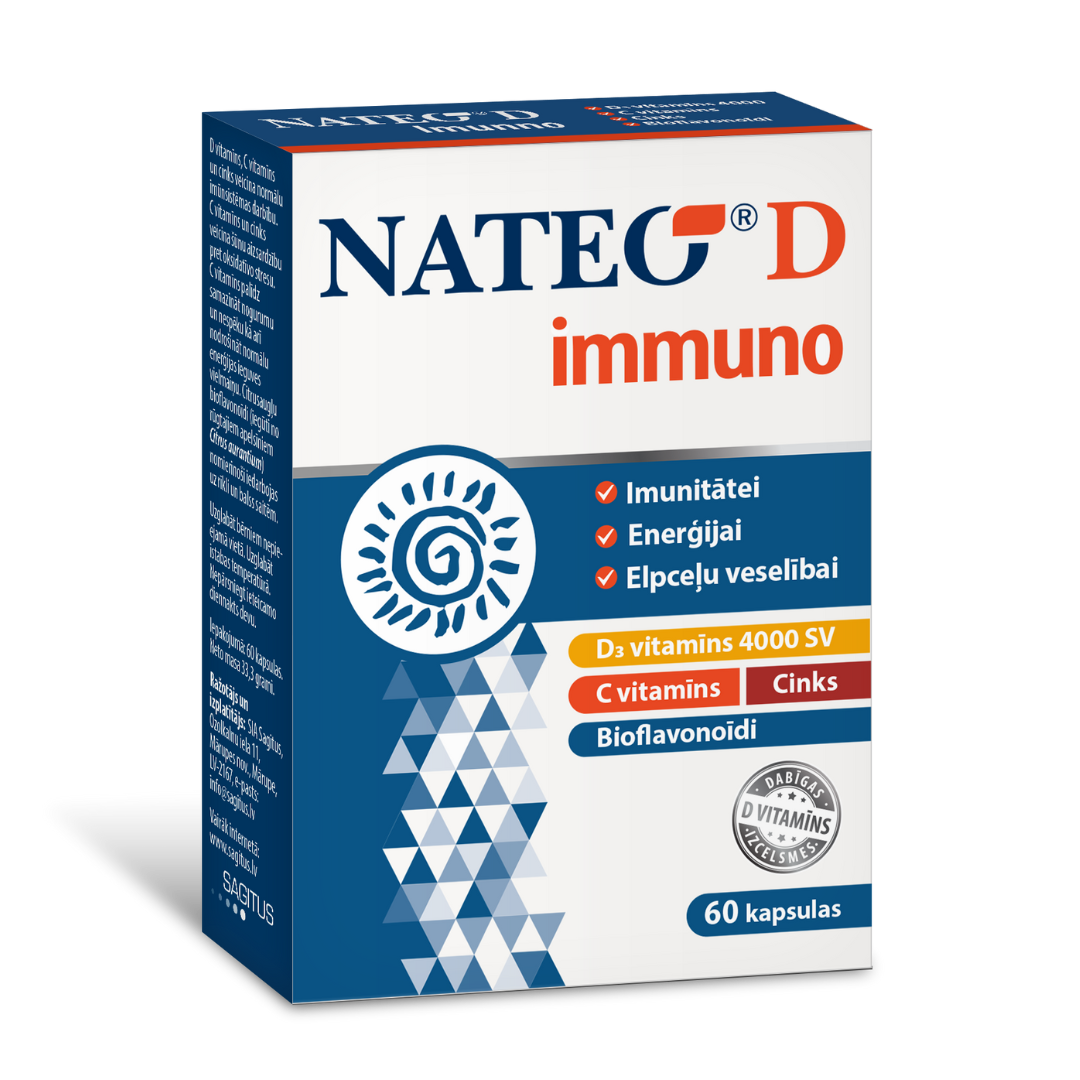 NATEO D immuno ir īpaši izmeklēta dabiska D vitamīna kombinācija ar C vitamīnu, cinku un rūgto apelsīnu bioflavonoīdiem. Tā sastāvā ir unikāla kombinācija, kas nodrošina trīskāršu atbalstu imunitātei.